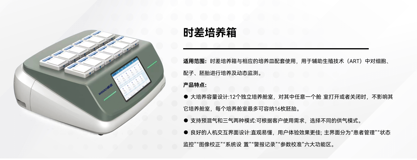 适用范围:时差培养箱与相应的培养皿配套使用,用于辅助生殖技术(ART)中对细胞、配子、胚胎进行培养及动态监测。